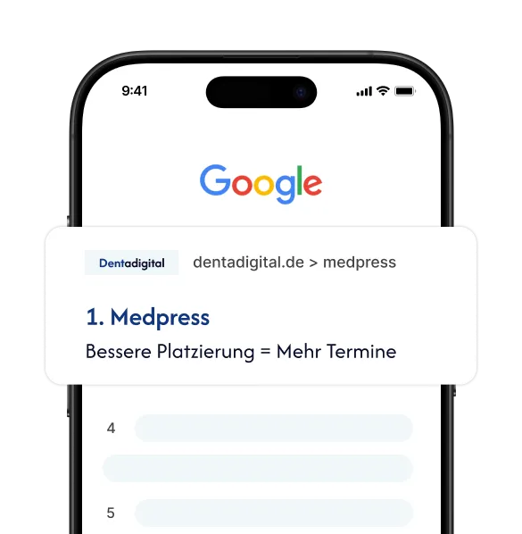 Wir sorgen dafür, dass Ihre Praxis angezeigt wird, wenn Patienten in ihrer Region nach einem Zahnarzt suchen — auf Google und darüber hinaus. Ihre Website enthält die richtigen Inhalte und technischen Einstellungen, damit Menschen Sie finden, Ihnen vertrauen und einen Termin buchen können.
